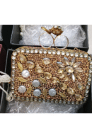Make a glamorous statement with this stunning hand-embellished golden clutch. Designed with intricate stones, pearls, and crystal work, it adds a rich, luxurious touch to any outfit. The unique double-ring handle makes it easy to carry while giving it a royal look.