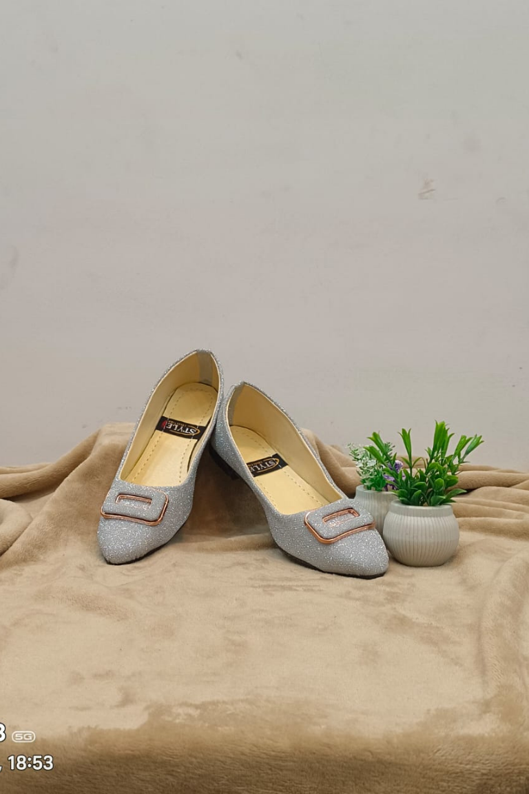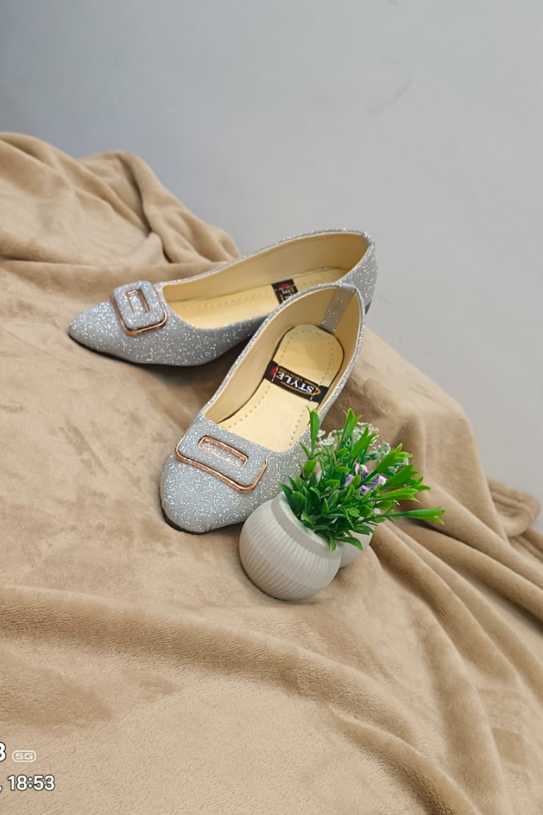 Add a touch of sparkle to your style with these elegant silver glitter flats. Designed with a chic pointed toe and a stylish buckle accent, they offer both glamour and comfort for all-day wear. Perfect for parties, casual outings, and festive events.